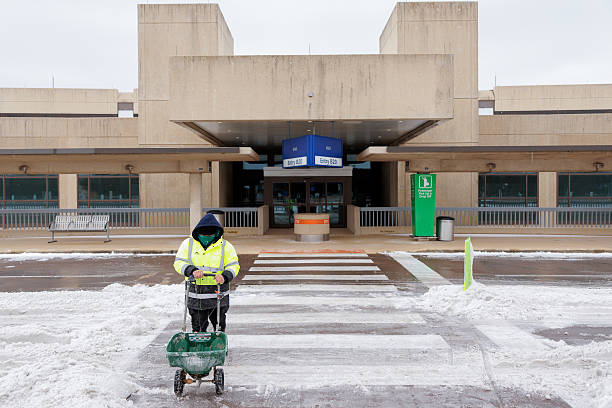 An airport employee salts a crosswalk outside of Dallas-Fort Worth International Airport (DFW) during a winter storm in Dallas, Texas, US, on Sunday, Jan. 25, 2026. A colossal winter storm reached the US East Coast Sunday morning after dropping ice and snow across much of the nation, leaving hundreds of thousands of homes without power and causing a wave of flight cancellations that may last for days. Photographer: Mark Felix/Bloomberg via Getty Images